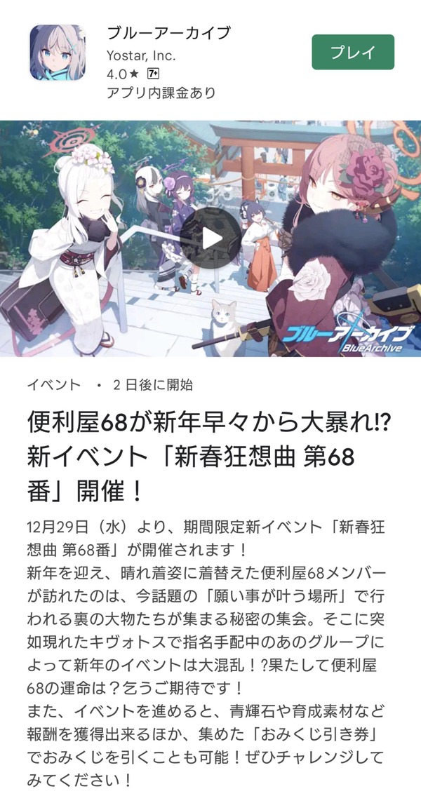 【ブルーアーカイブ】新イベント「新春狂想曲 第68番」 など 12/29(水) 12:00 〜 20:00メンテナンス